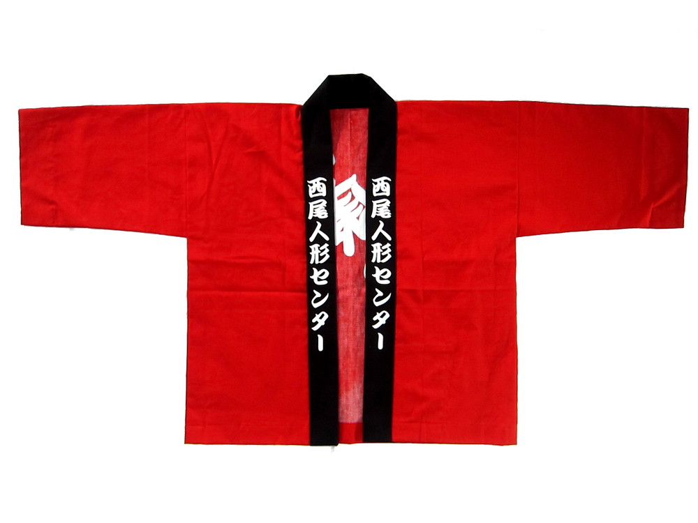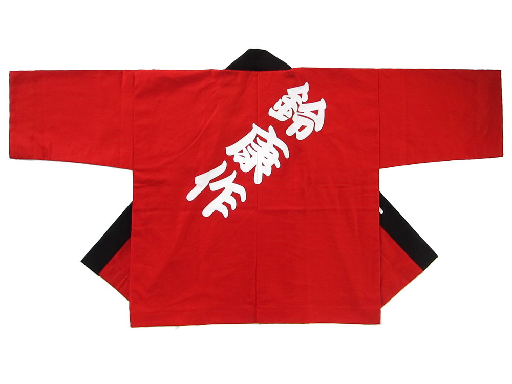 今回作成いたしました法被はお店のスタッフ様用、シンプルですが明るい赤をベースのやや丈を短くして、動きやすさを優先した仕上がりとしました。