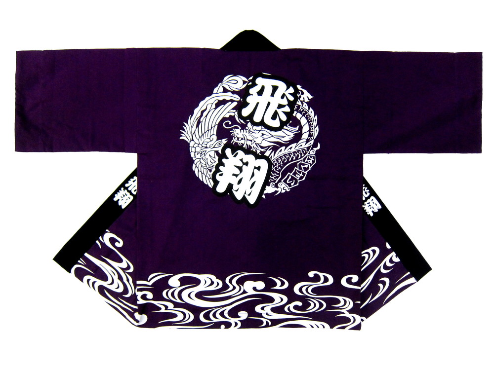 地色は「なす紺」で絵柄と文字を白抜きで表現、背中には威勢の良い龍と鳳凰を纏(まと)います。