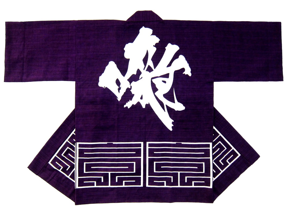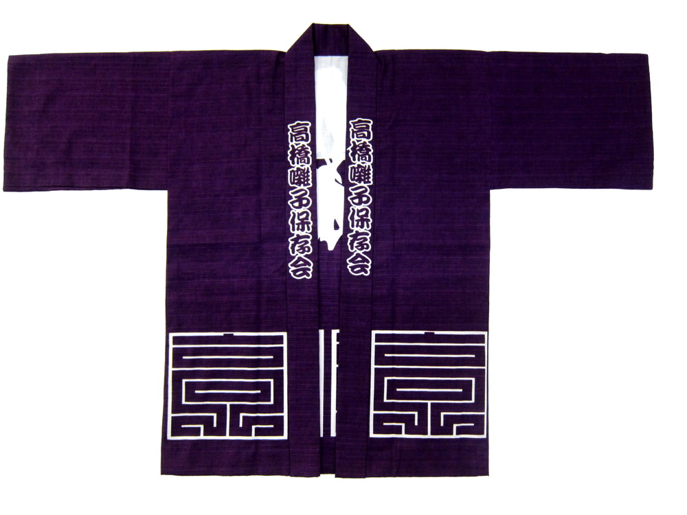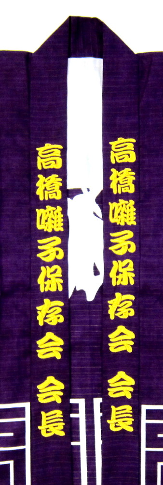 同好会・保存会様 高橋囃子保存会様 愛知県豊田市のお祭り保存会の皆様よりご注文いただきました。 背中に大きめの「囃」の一文字が効いています。染めは反応染め(本染め)、素材はお客様のご希望で薄めで丈夫なシャンタンを使用、生地全体が横縞風に織られていて清涼感も感じられます! 会長様には特別仕様にて衿の文字を金刺繍で作成いたしました。濃い紫地によく映えていますね。