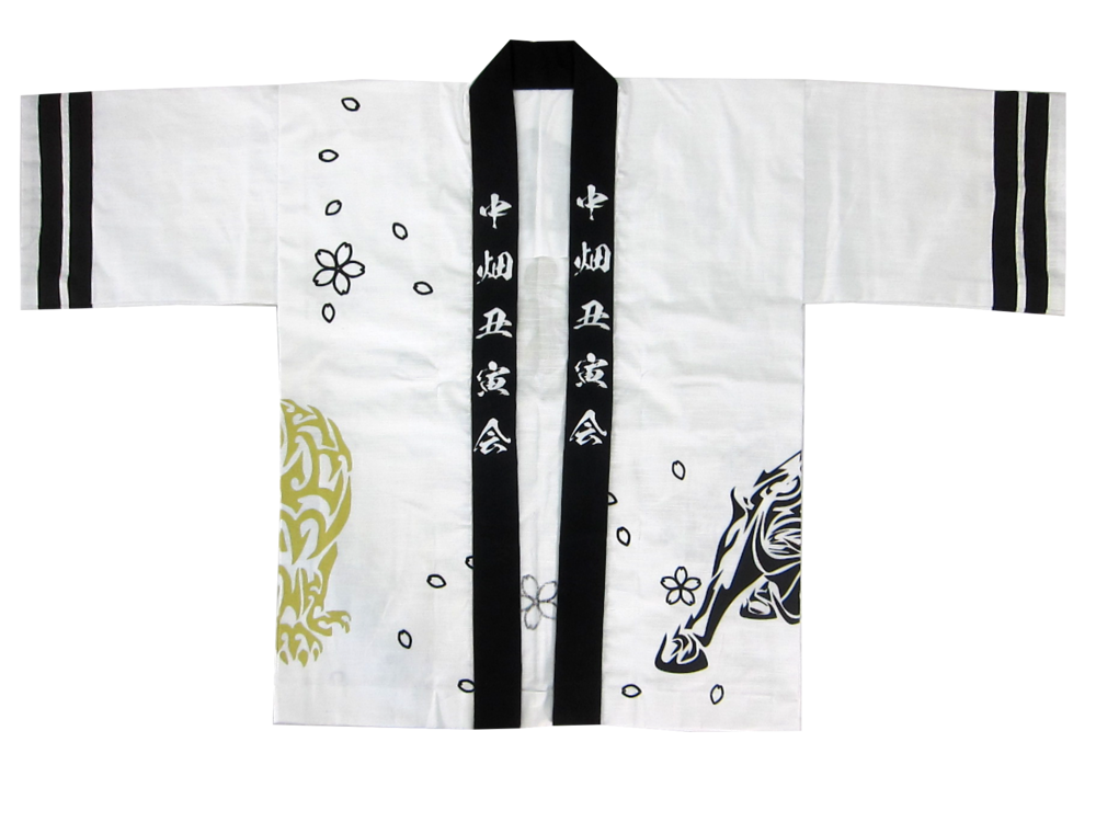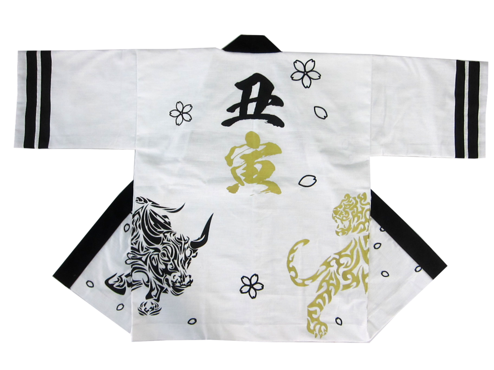 神社仏閣・厄年会様 中畑丑寅会様 地元厄年会様(男性25歳)用のオリジナル法被です。 白地に黒と金で2色で作成。 干支の丑と寅のイラストが勇ましいですね!!生地は厚地のスラブという紬風の素材をチョイス。 男の本厄でもある42歳まで、末永くご使用可能な法被なのです。