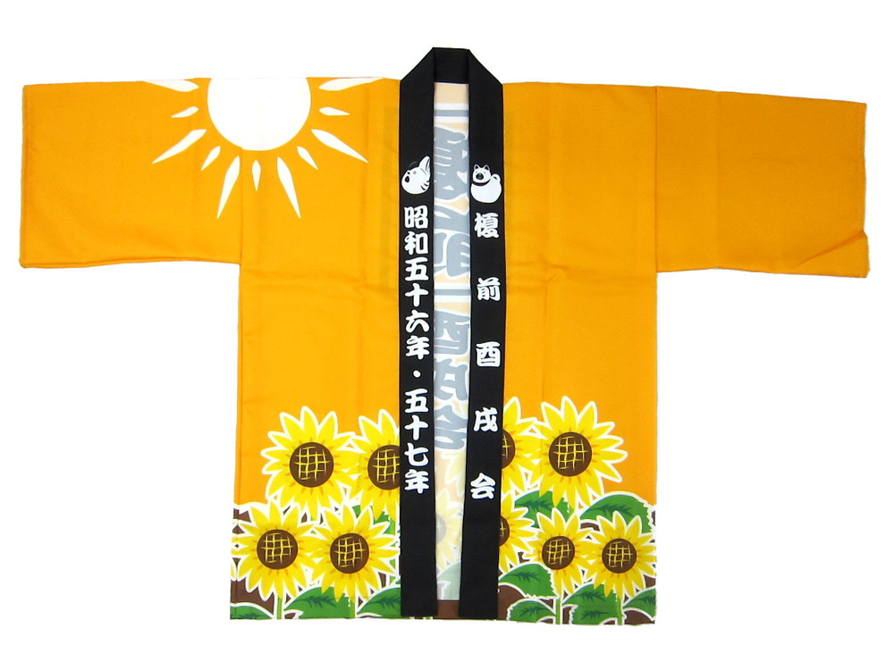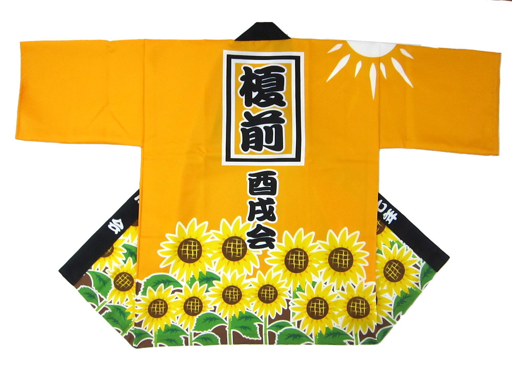 神社仏閣・厄年会様 榎前酉戌会様 今年の榎前厄年会の皆様は「ひまわり」をモチーフにした明るい法被をインクジェットプリントで作成させていただきました! 生地はポリエステルのトロマットというシワになりにくい生地を使用。軽くて着心地も抜群です。 さて来年はどんなデザインになるか今から楽しみです♪