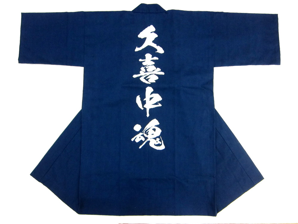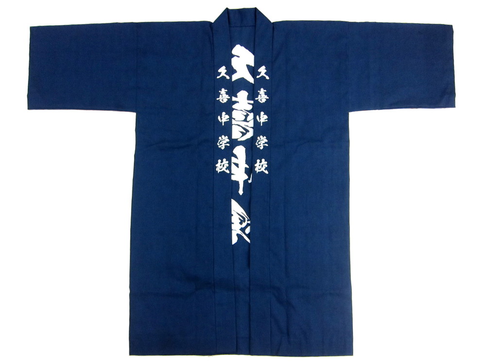シンプルに学校名を筆文字の書体で染め抜いた長法被(105cm)です。生地はオールマイティに着用可能なシャークスキン、染め方法は本染め(反応捺染)です。