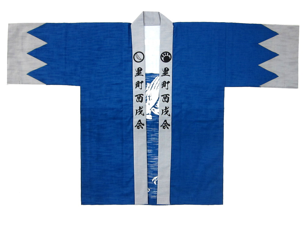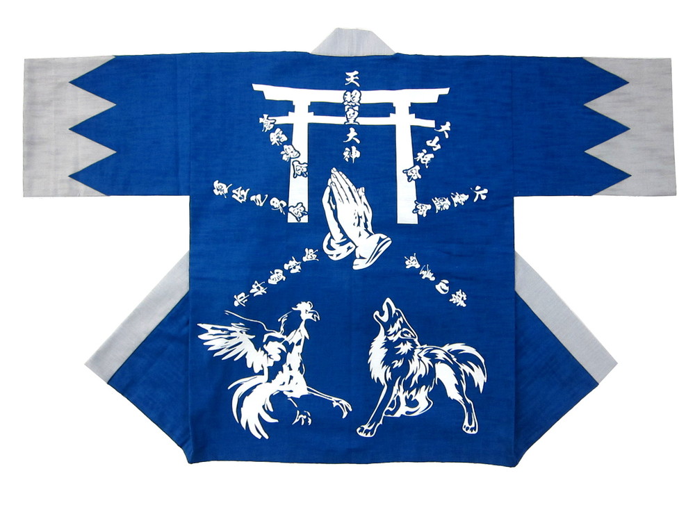 神社仏閣・厄年会様 里町酉戌会様 澄み渡る青空のような鮮やかなブルーとグレーとのコントラストがいいですね! 背中の染め抜いた神社ご参拝に、干支である酉戌のデザインですね。 本染めにスラブという生地で作成いたしました。 皆様が無事に厄落としできますようお祈りしております。