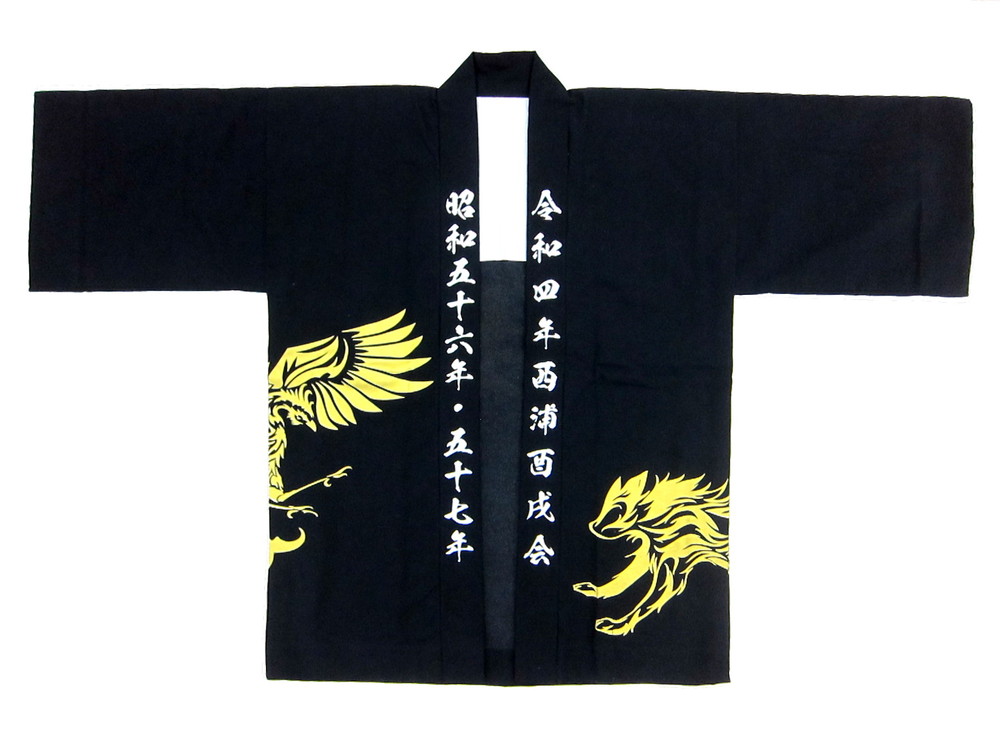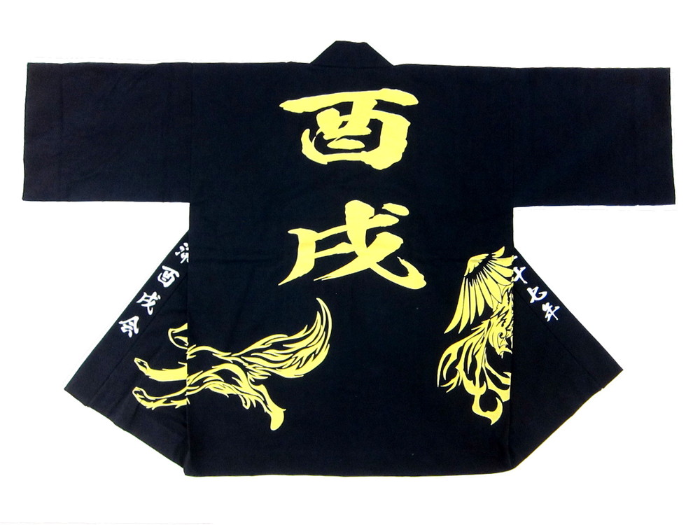 神社仏閣・厄年会様 西浦酉戌会様 愛知県蒲郡市の厄年会様です。 今回の法被は本染めにて黒無地染めの後、絵柄を金プリントしています。 素材は天竺、金の豪華さが引き立つ素敵な法被が出来上がりました! 西浦厄年会の次年度の皆様も宜しくお願い致します。
