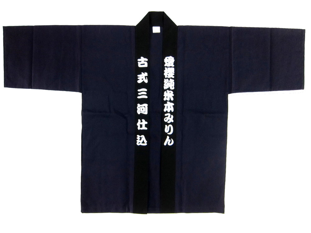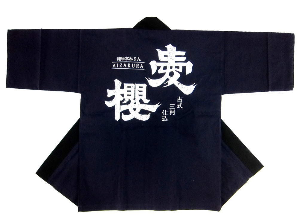 弊社カタログ製品よりお選びいただいた濃紺の無地法被に背中と両衿にプリントという手法でのセミオーダー作成になります。