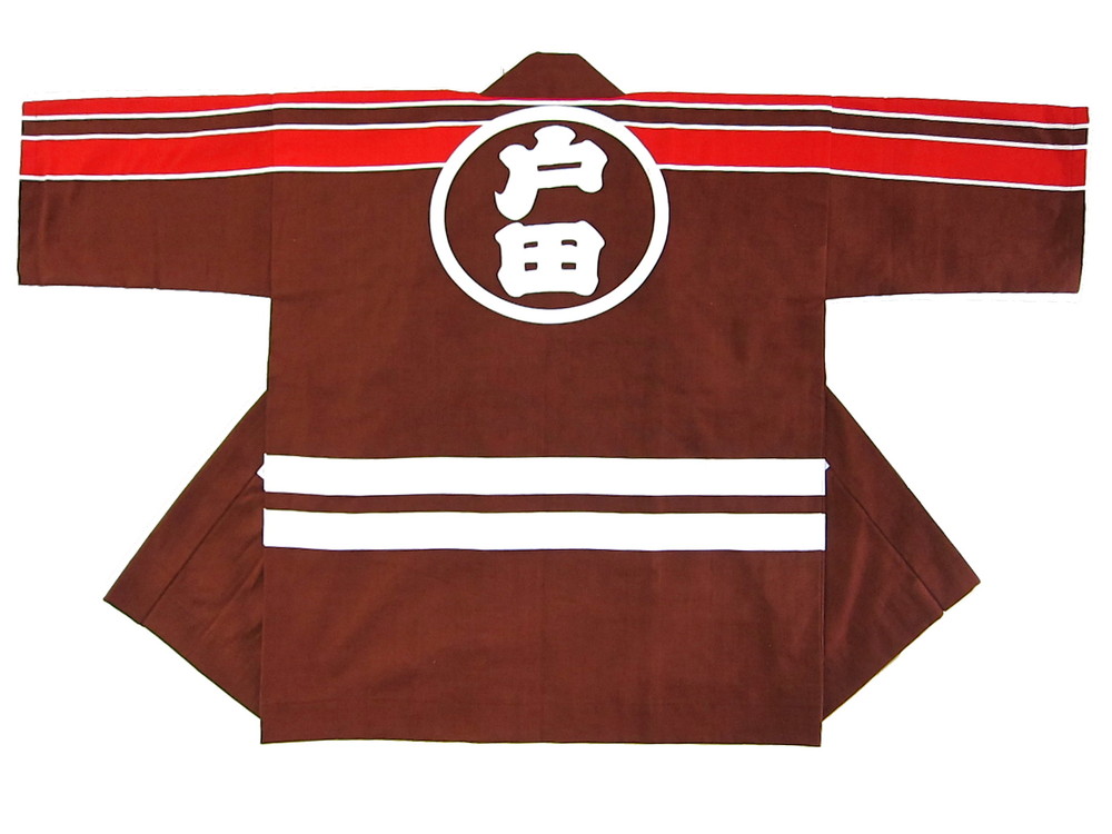 一般的な消防団様の法被デザインですがご婦人ということもあり配色を変えました。渋めの茶入りの地色に赤ラインと白抜き文字がオシャレですね。