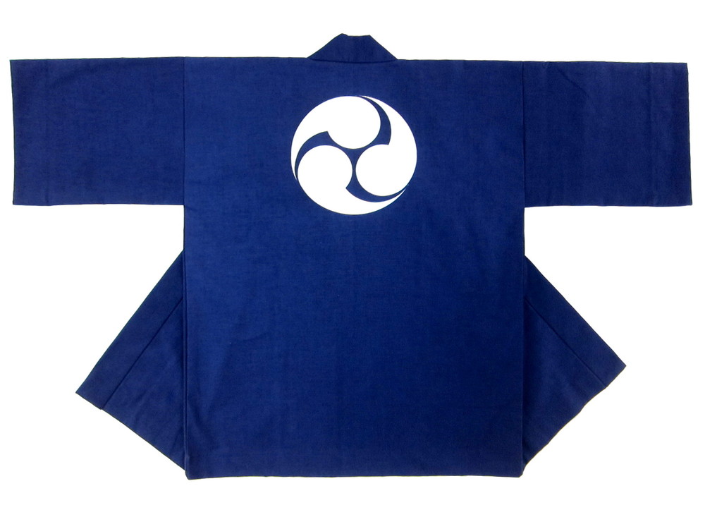 神社仏閣・厄年会様 八幡神社氏子総代様 「三つ巴紋」 皆様には比較的目にすることが多いこの家紋、実は全国各地にある八幡神社の神紋なんですね。その由来は諸説あるようですが、武士が弓を引くときに指を守るための道具「鞆(とも)」の形に似ていることから武士の身を守るという思いもあったようです。 生地は高級感のあるスラブを使用、職人による本染めで綺麗な紺色がシンプルデザインに映えてますね~