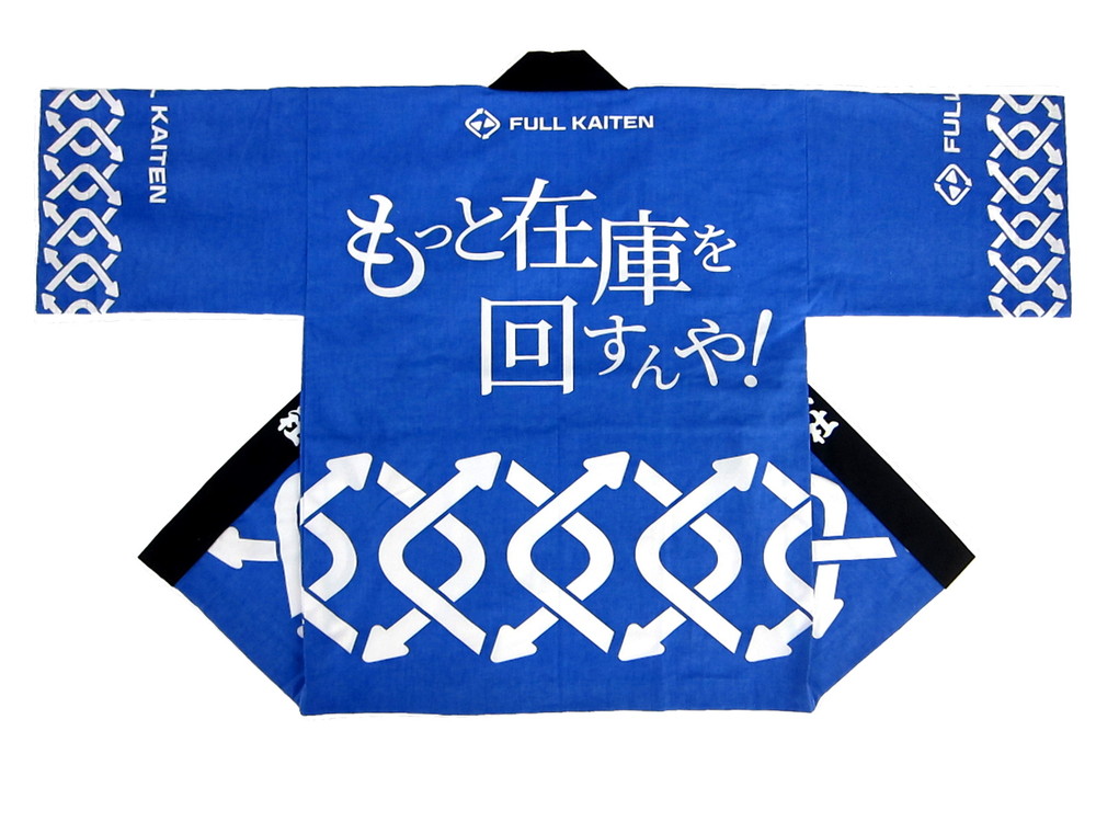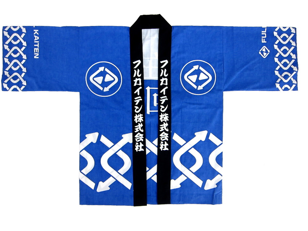 企業・学校・自治体様 フルカイテン様 企業様の展示会用にスタッフ法被を作成させていただきました。 作成方法は本染め、素材は天竺を用いており、羽織っても軽くこれからの季節にも良いですね。 企業スローガンをPRするのにわかりやすいデザイン法被、熱いです!!