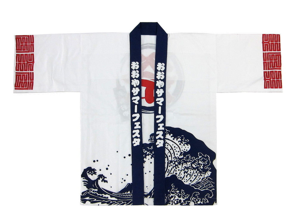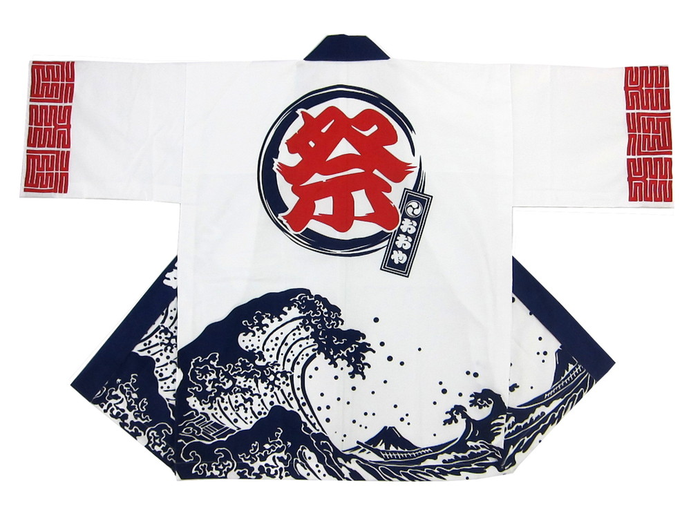 作成は手染め職人による本染め(顔料染め)、生地は通常より一段強くてしかも発色性の良いシャークスキンをご用意させていただきました。白地に北斎の波柄が威勢の良いイメージです。赤の背紋も目立ってますね。