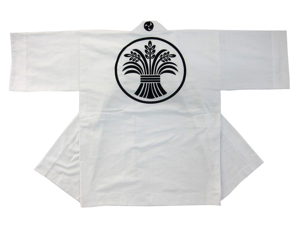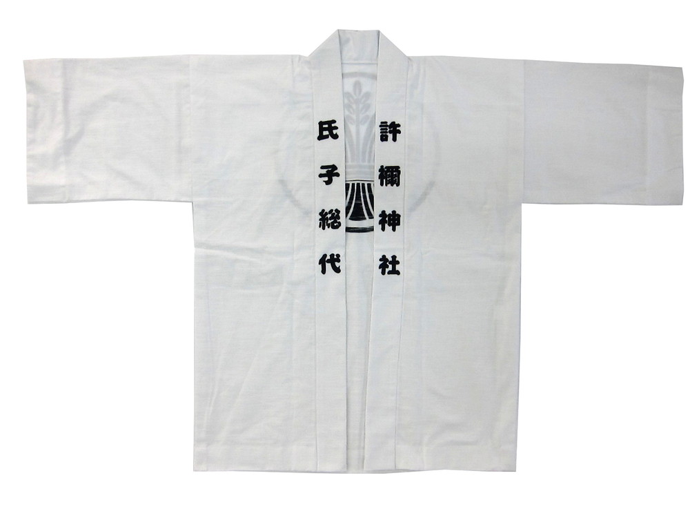 神社仏閣・厄年会様 杵禰神社氏子総代様 背中の「束ね稲穂紋」は一般的な家紋ではなくお客様のオリジナル紋です。 白無地素材は天竺、紋と衿文字は顔料染めでくっきり鮮やかに仕上がりました。 神社様にも喜んでいただき、弊社としても満足なのです。