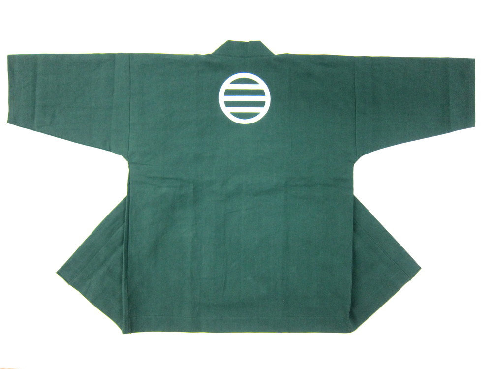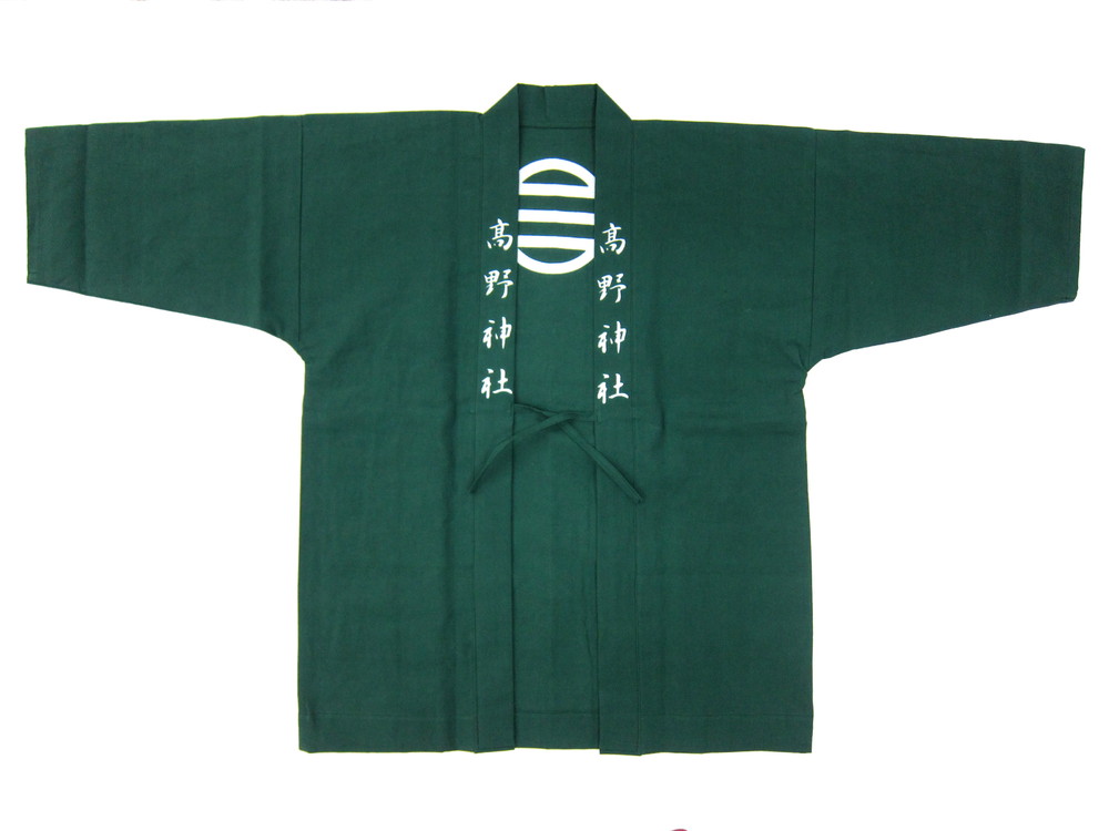 神社仏閣・厄年会様 髙野神社様 獅子舞の方が着用される薄地の法被です。 作成方法は職人による本染め、生地は法被の定番生地天竺です。 袖付けをややカーブさせたデザインですので腕の動きが窮屈にならないのと、帯ではなくて前紐付きなのがポイントですね。