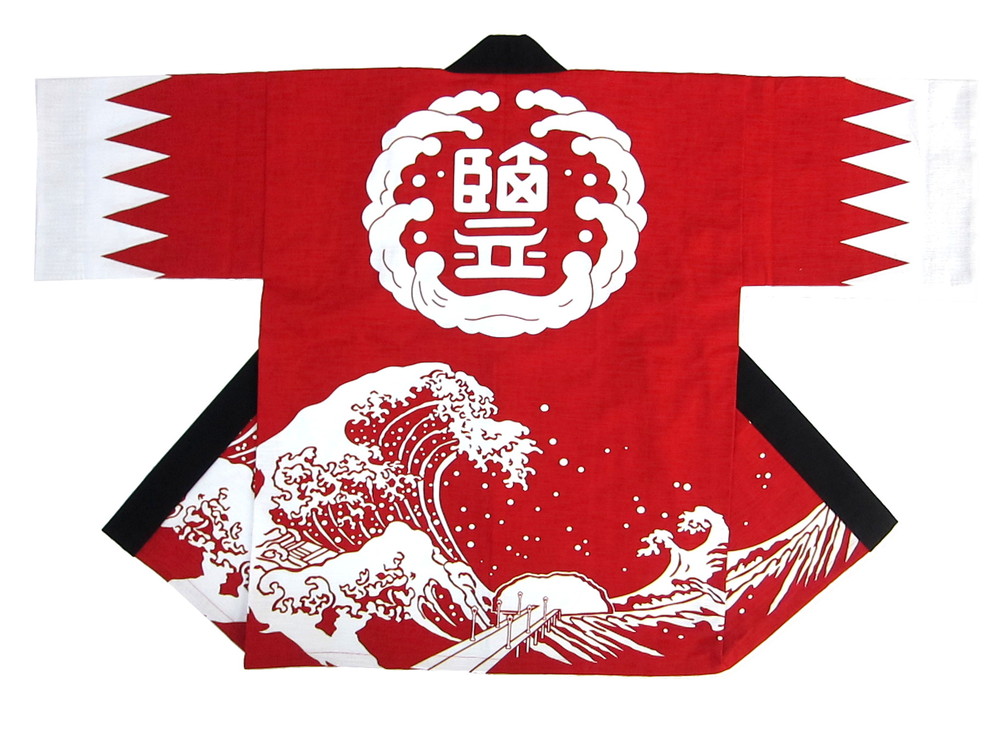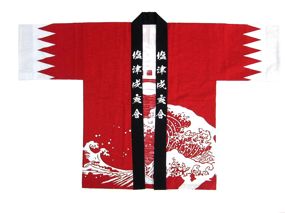 神社仏閣・厄年会様 塩津戌亥会様 こちらは毎年蒲郡の海を表現した「北斎の波柄」を使用した基本デザインでの作成をいただいています塩津厄年会の皆様です。 袖先を今回は「新選組」の法被仕様としてみましたが、全体の雰囲気によくマッチしていますね! 素材をスラブ、本染めにての作成です。 ご要望の強めの赤色も落ち着いたイメージで素敵ですね。 波の中央は実際の「竹島」と橋をイメージしました~