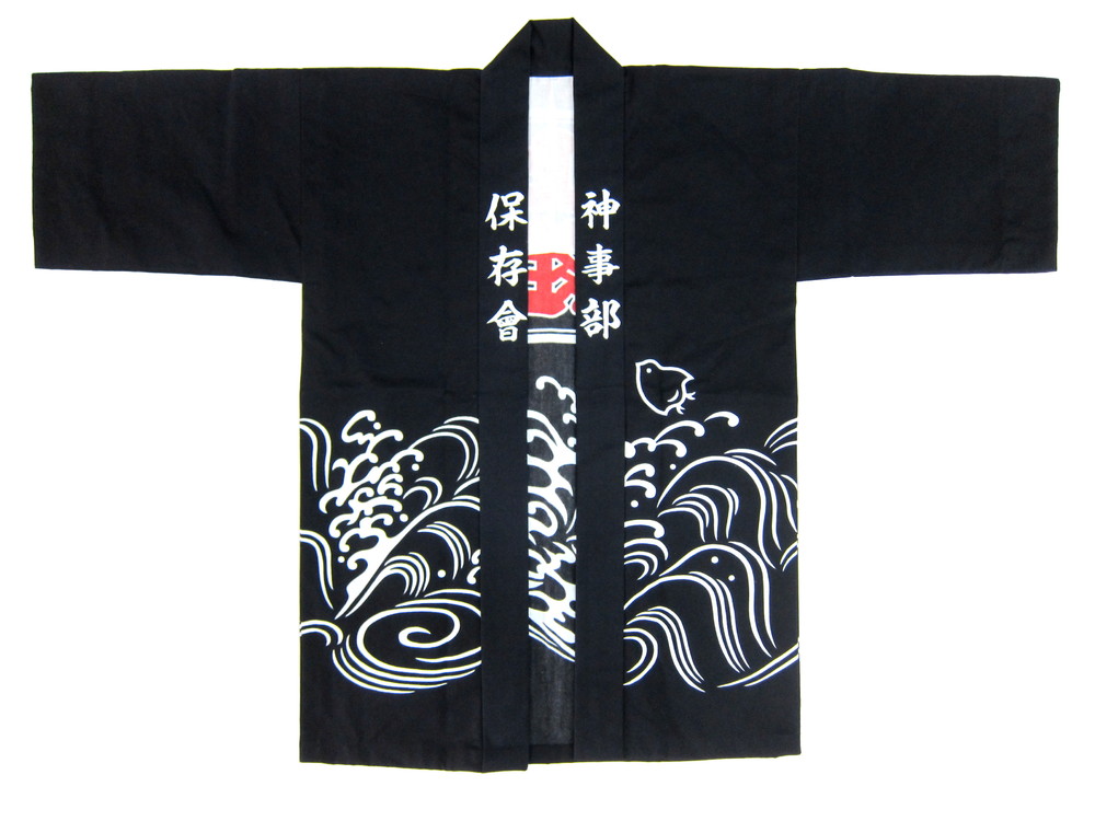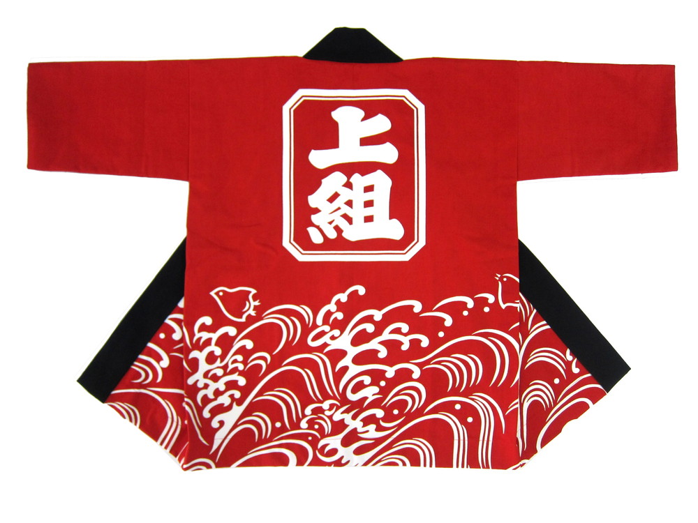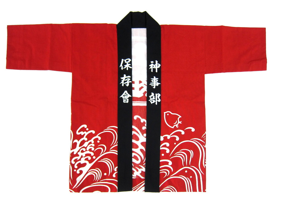 同好会・保存会様 上ヶ祭り囃子等保存会様 リピートのお客様、今回は女性と子供様用に赤い法被も新調いただきました。 素材は前回同様79Aというややしっかり目の生地を使用して、染めも前回と同じく本染めでの作成になります。 この古典的な波柄が良いですよね~