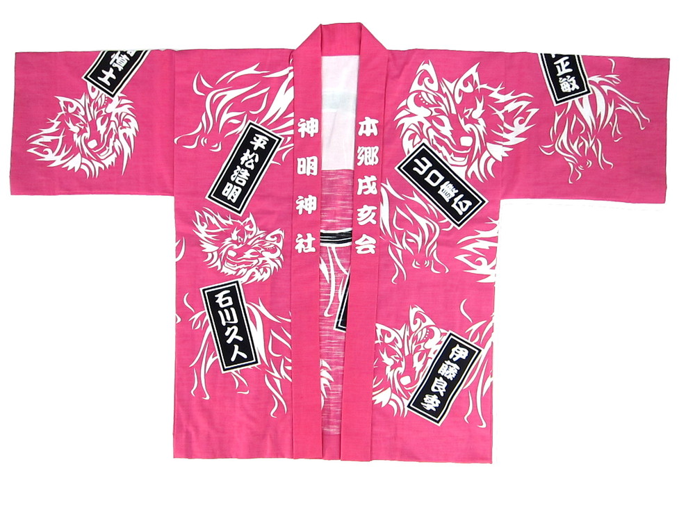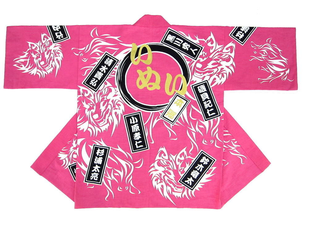 神社仏閣・厄年会様 小垣江本郷戌亥会様 新年最初の製作事例はやっぱり厄年会の皆様! 思い切ったピンク地にゴールドでプリントといかにも新春らしくて良いですね。 生地はスラブ、なかなか細かいデザインは職人泣かせではありますが、お客様のはっぴーのためならと頑張らせていただきました。作成方法はなので本染めです。 無病息災間違いなしでございます。