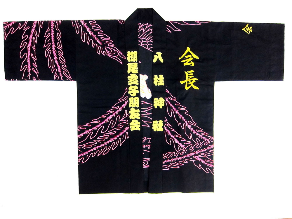 神社仏閣・厄年会様 棚尾亥子朋友会様 本染め+金刺繍もふんだんにあしらってみました。 生地はシャークスキン、反応捺染(本染め)に背文字や役職文字などは贅沢に金色刺繍という素敵な法被です。 地域によっては厄除け法被の作成など、厄払い行事のために若いころから皆さん積み立てていらっしゃるところもあるようですので・・・。