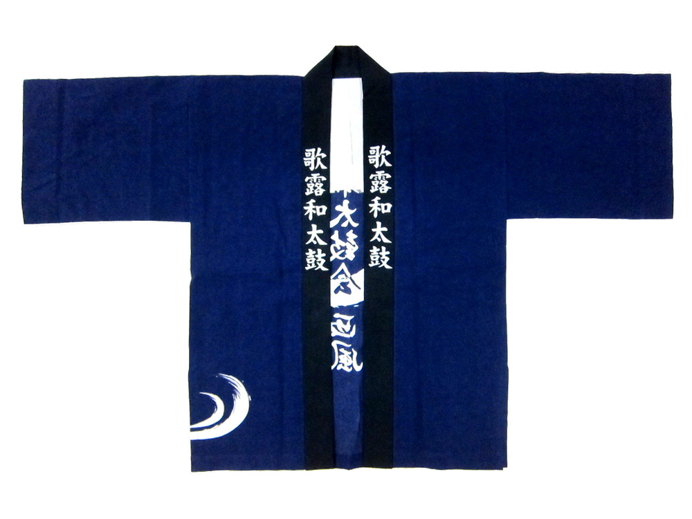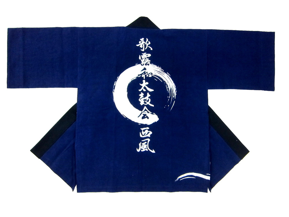 同好会・保存会様 歌露和太鼓会様 北海道えりも町でご活躍中の太鼓グループ様です。 反応本染め、生地は天竺になります。 太鼓演奏の際、動きやすいように両サイドにはスリットを入れ、丈もやや短めにオーダーいただきました。 裾にいち塵の「風の舞」!!おしゃれですね。