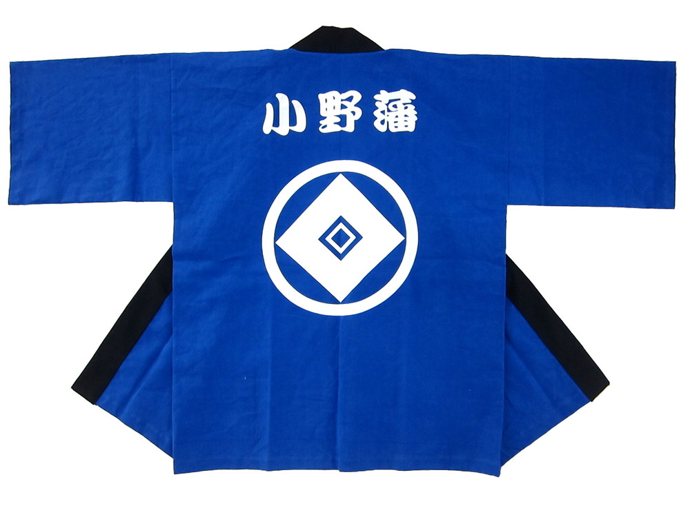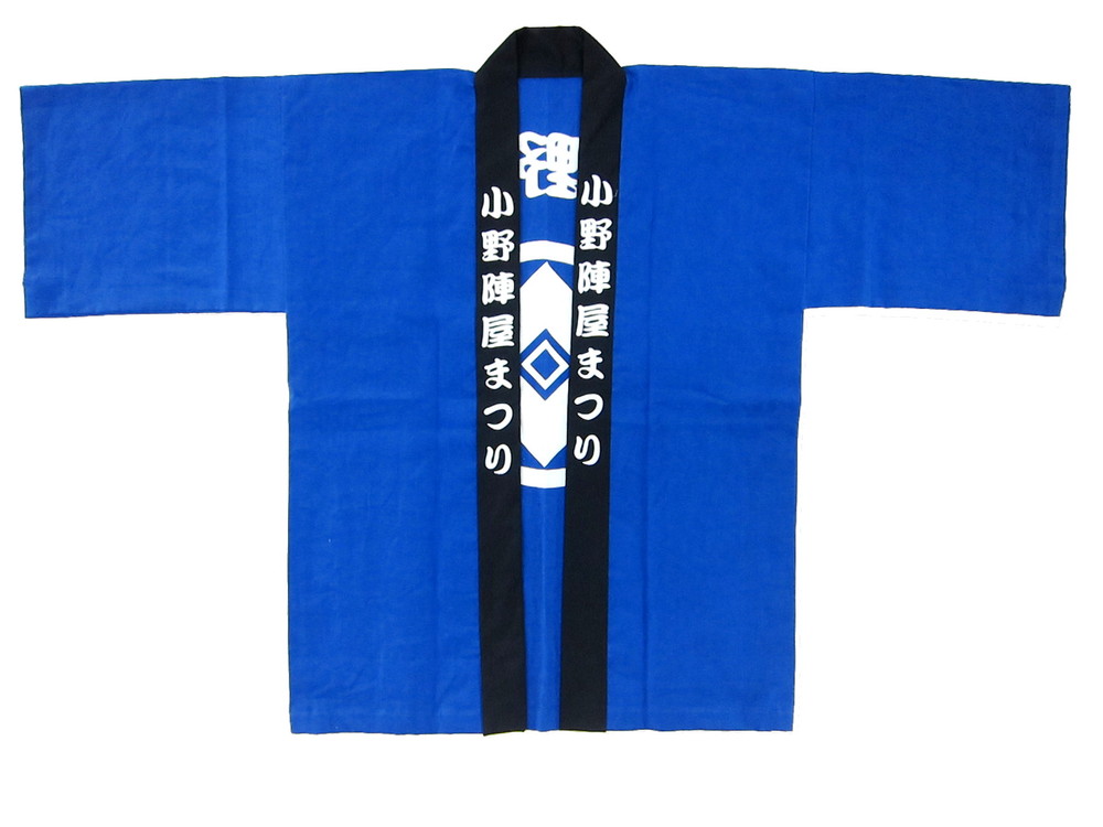 地域団体・業界団体様 小野陣屋祭り様 兵庫県小野市のお祭り法被! 背中の家紋が歴史を感じさせてくれています。 素材は春祭りに着るのにちょうど良い天竺、反応捺染本染めで軽やかにそして本格的な印半纏をお楽しみください。