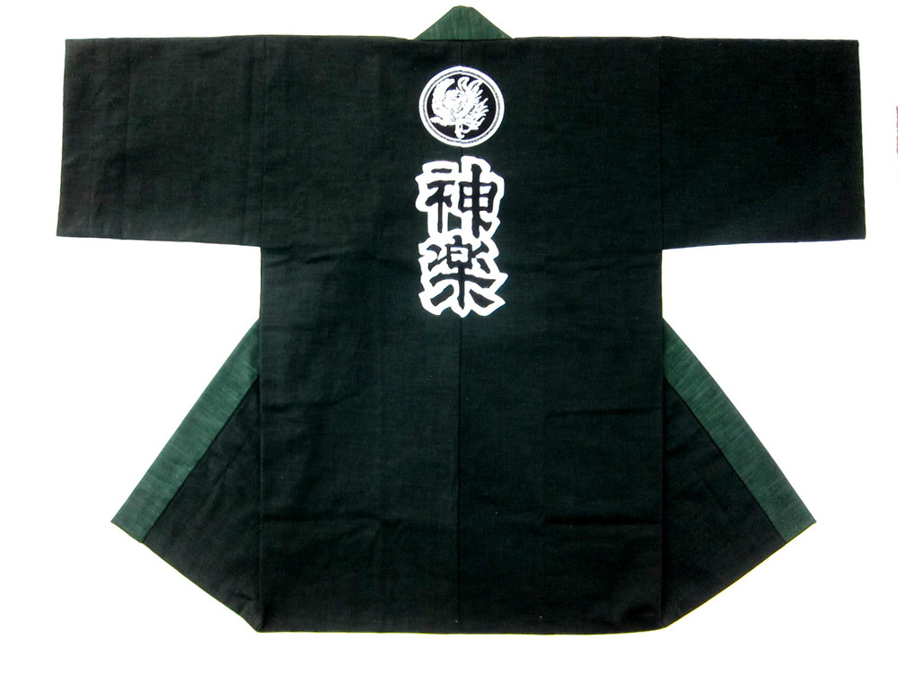 同好会・保存会様 太々神楽保存会様 栃木市の神楽保存会様よりご注文いただきました。 濃いグリーンと淡いグリーンの配色もおしゃれですね。 身丈100cmの長法被は本染め、生地は和風で高級感のあるスラブで作成させていただきました。 着用感も貫録の一枚でございます。