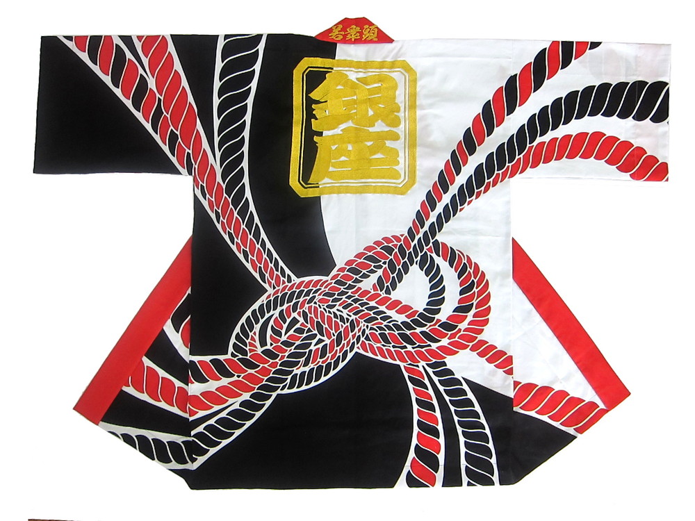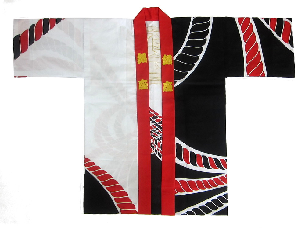 生地に顔料で染め抜いた法被に文字は全て金刺繍で作成いたしました。