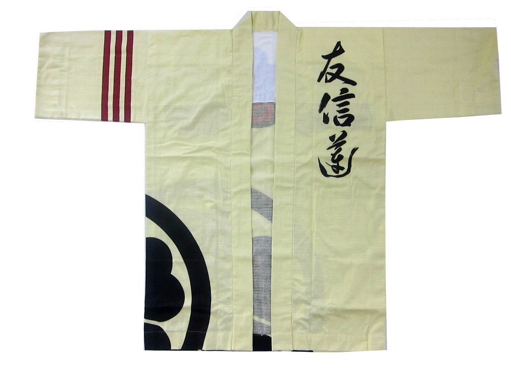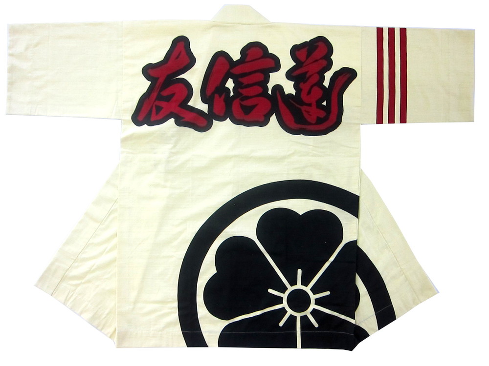 同好会・保存会様 友信蓮様 薄クリーム色をベースにしたフルオーダー法被です。 生地は夏向きなシャンタン、地色を反応染めした後に顔料で文字、紋を捺染してあります。 ダイナミックなデザインと清涼感のある素材感のマッチングが素敵ですね。