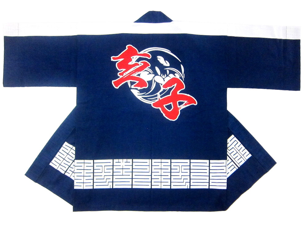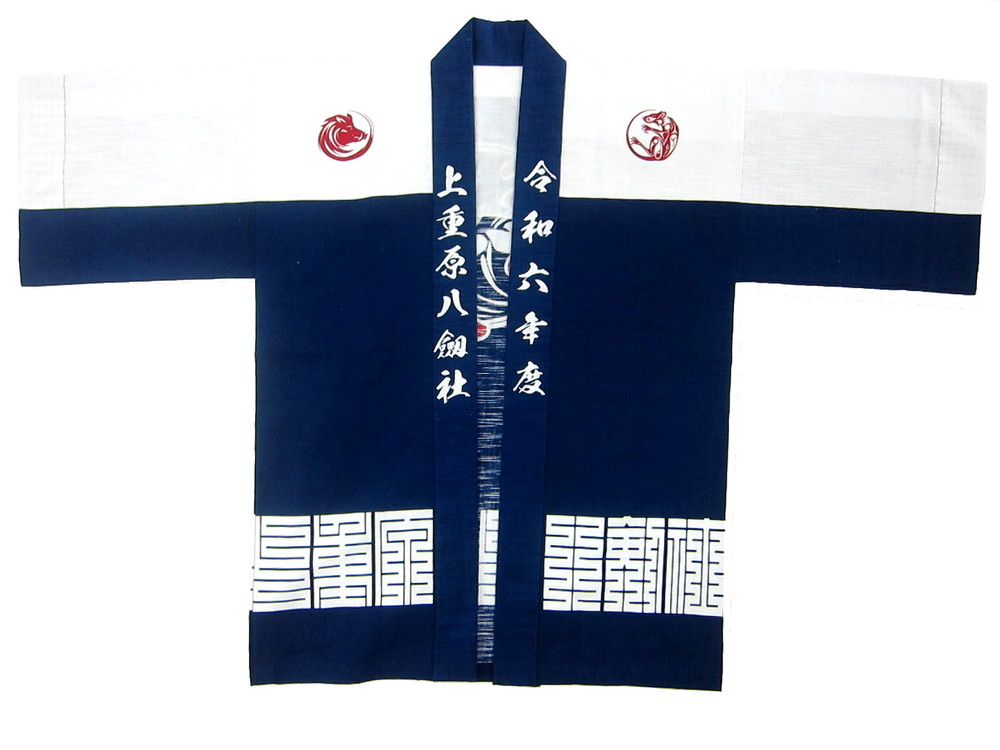 神社仏閣・厄年会様 上重原亥子会様 愛知県知立市の厄年会様です。 背中のカキツバタは市の花、左右胸のワンポイントの柄は亥(イノシシ)と子(ネズミ)をあしらってあります。 素材はスラブ、本染めでしっかりと染め抜いてあります。 素敵なデザインでございます。