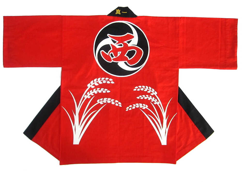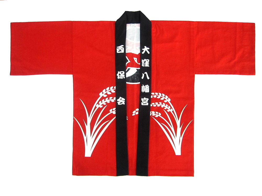 神社仏閣・厄年会様 西保会様 兵庫県明石市の「大窪八幡宮」のお祭りに着用されます。 赤の鮮やかな地色がいいですね。本染め、生地は厚地の10番天竺をお選びいただきました。 秋のお祭りに稲穂デザインがよく映えています。