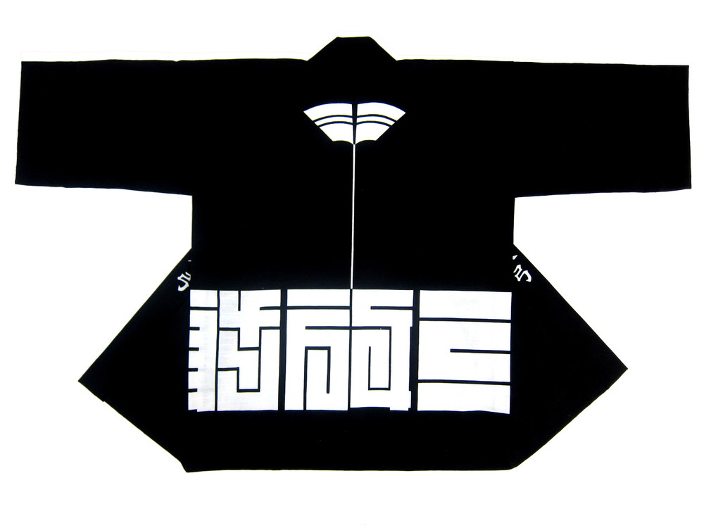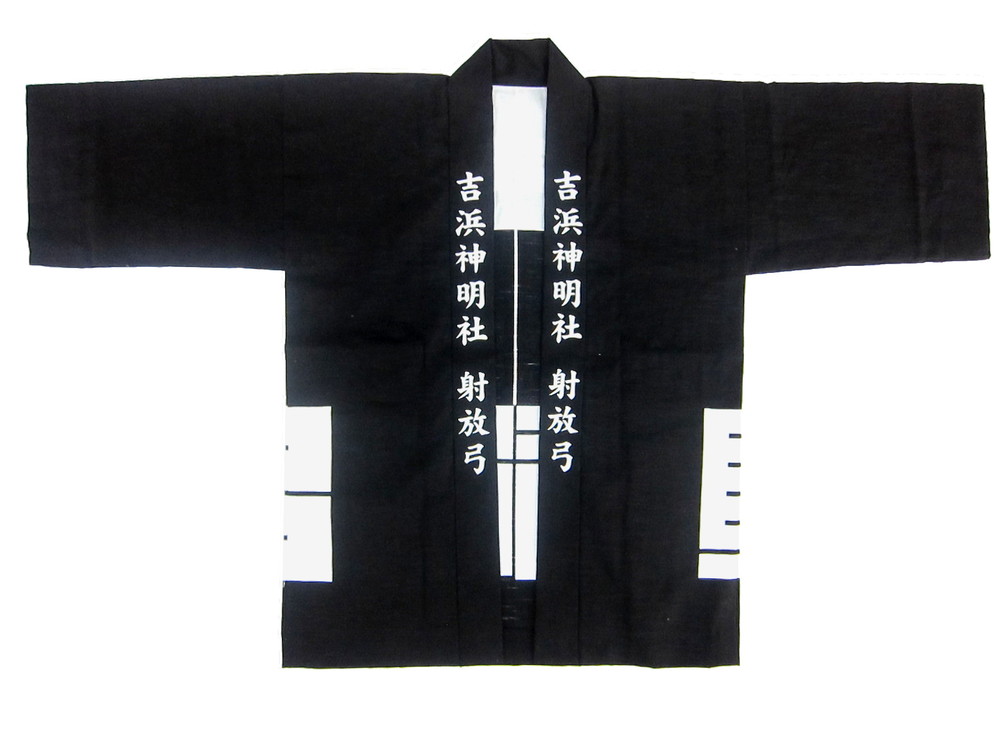 神社仏閣・厄年会様 吉浜神明社様 愛知県高浜市の吉浜神明社で行われる伝統行事の一つ「射放弓」。毎年選ばれた若者二人が弓を天に向かい放ちその年の五穀豊穣を願います! 黒地一色のシンプルデザインに素材は紬感のあるスラブを使用した反応染め抜き法被です。