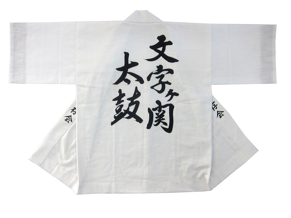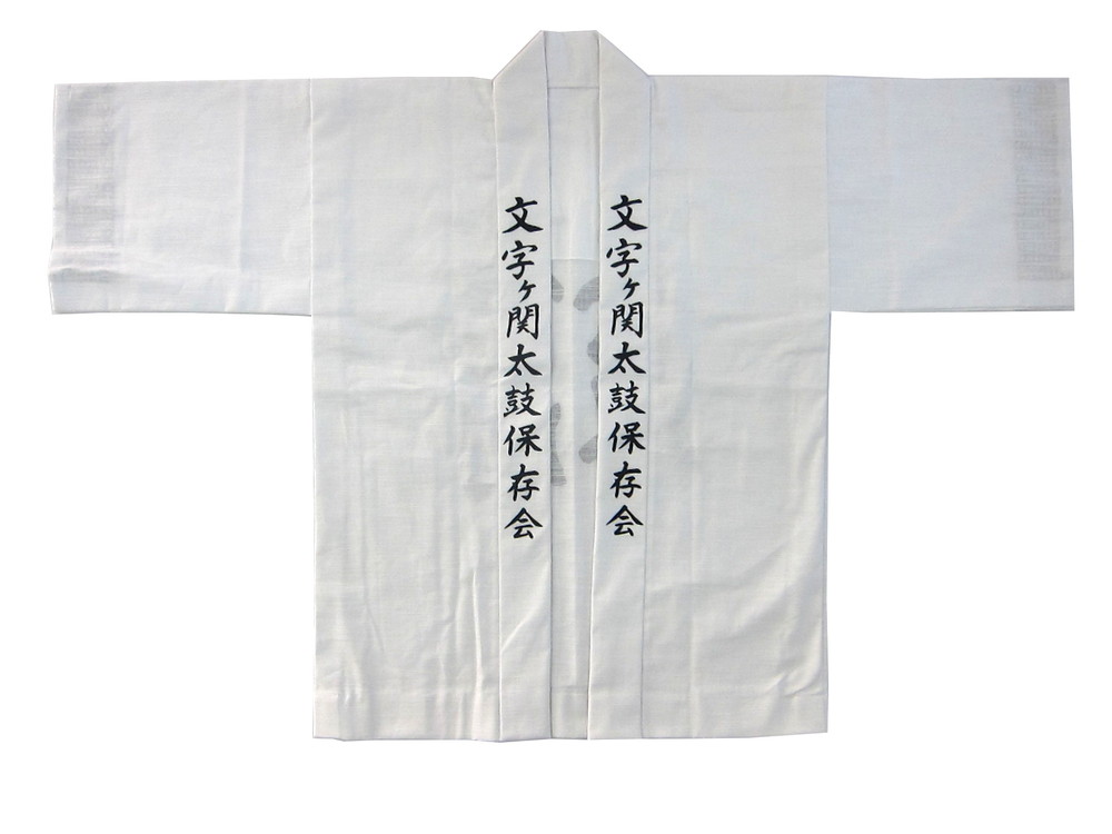 同好会・保存会様 文字ヶ関太鼓保存会様 白地の法被に顔料染めで作成いたしました。 手描きの筆文字を取り込んでありますのでオリジナル感いっぱい、格好いいのです。 生地はスラブを使用、丈夫で高級感も漂いますね。