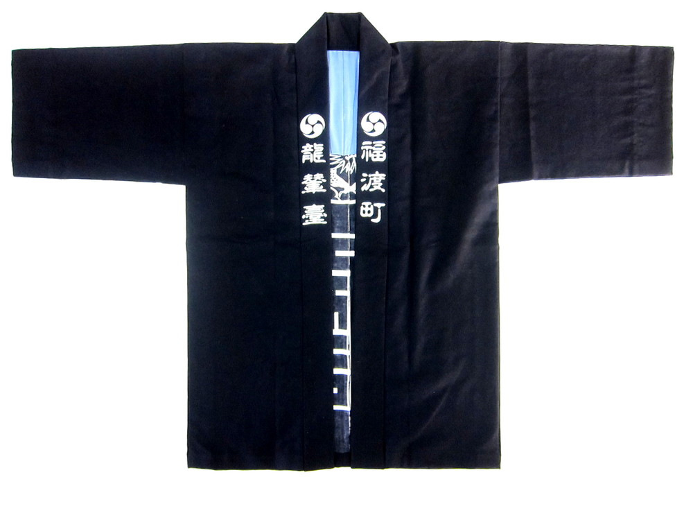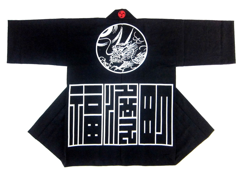 地域団体・業界団体様 福渡町町内会様 濃紺に白抜き+衿首に家紋を赤で染め抜き、全体的に落ち着いた色目配色にシンプルなデザインが素敵です。 生地も伝統的なこだわりの法被素材である丸紡27貫を使用しており、背縫い付きのフルオーダー本格お祭り半纏なのです。
