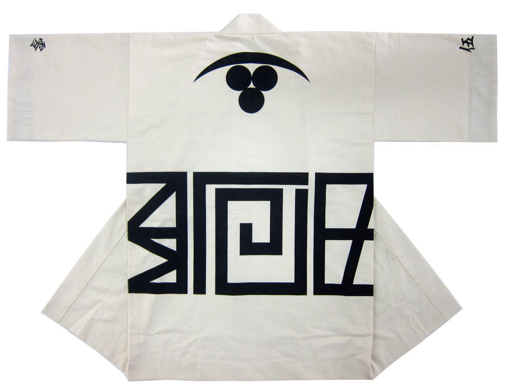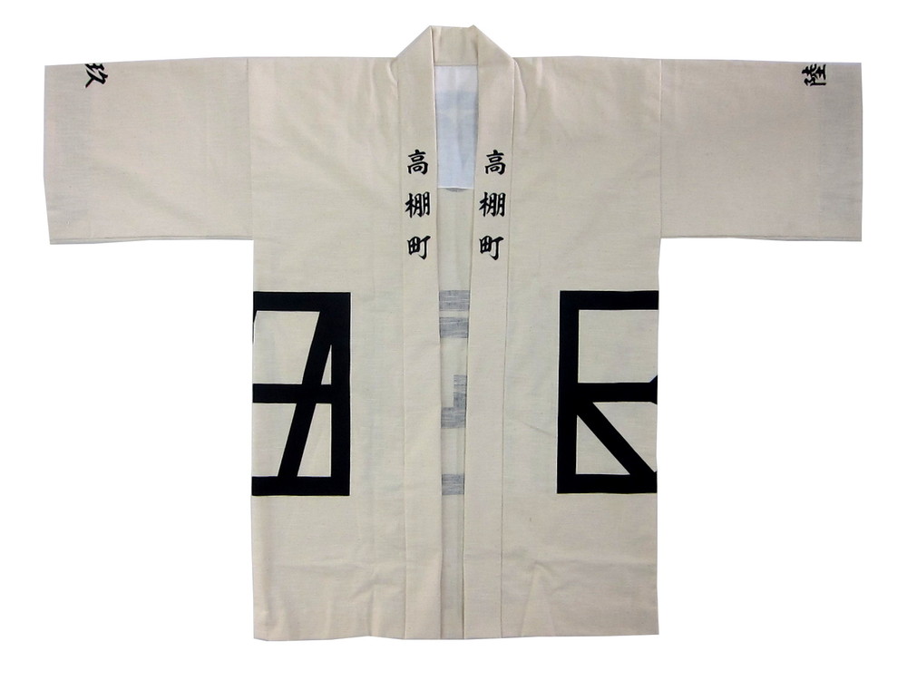 神社仏閣・厄年会様 高棚町子丑会様 95cm丈の長法被です。 使用生地は晒をしていない状態の生成りのスラブで真っ白よりやや高級感のあるイメージですが、経年劣化で色あせが若干ですが早いのでご注意を。 染めは顔料での捺染で、くっきりとオリジナルの裾の文様も映えてます!