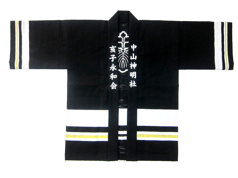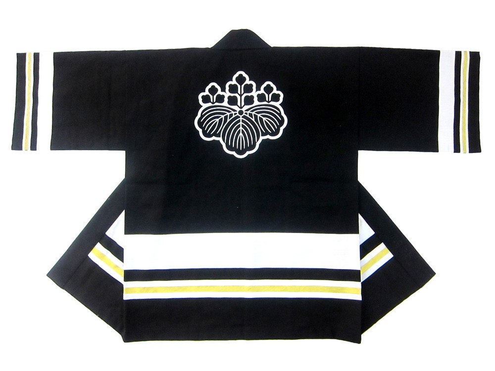 神社仏閣・厄年会様 中山神明社(亥子永和会)様 黒地に背紋(五三の桐)を白抜き。 シンプルデザインですが裾と袖口のラインの中にゴールドのラインが一本入っています。 染めは本染め、生地はスラブで和風なイメージが素敵です。