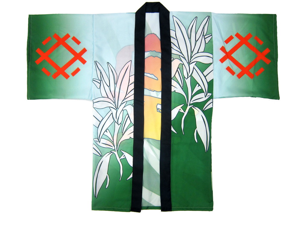 インクジェットプリントで、よさこい衣装のように振袖仕様の長法被です。生地はポリエステルでもやや中厚イメージの「トロピカル」を使用ですが、柔らかな風合いで踊り映えすること間違いないですね。