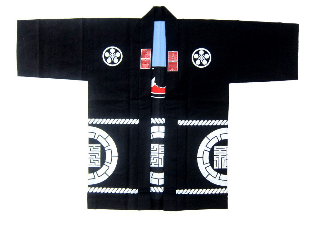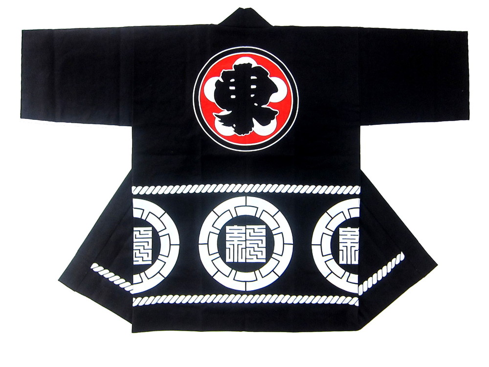 地域団体・業界団体様 東大高紅会様 紺地に赤と白抜きが映えてます。 身丈90cmのやや長めのデザインで本染め、生地は天竺になります。背紋や裾柄のデザインもよく考えられていてクラシックイメージで格好良いですね。