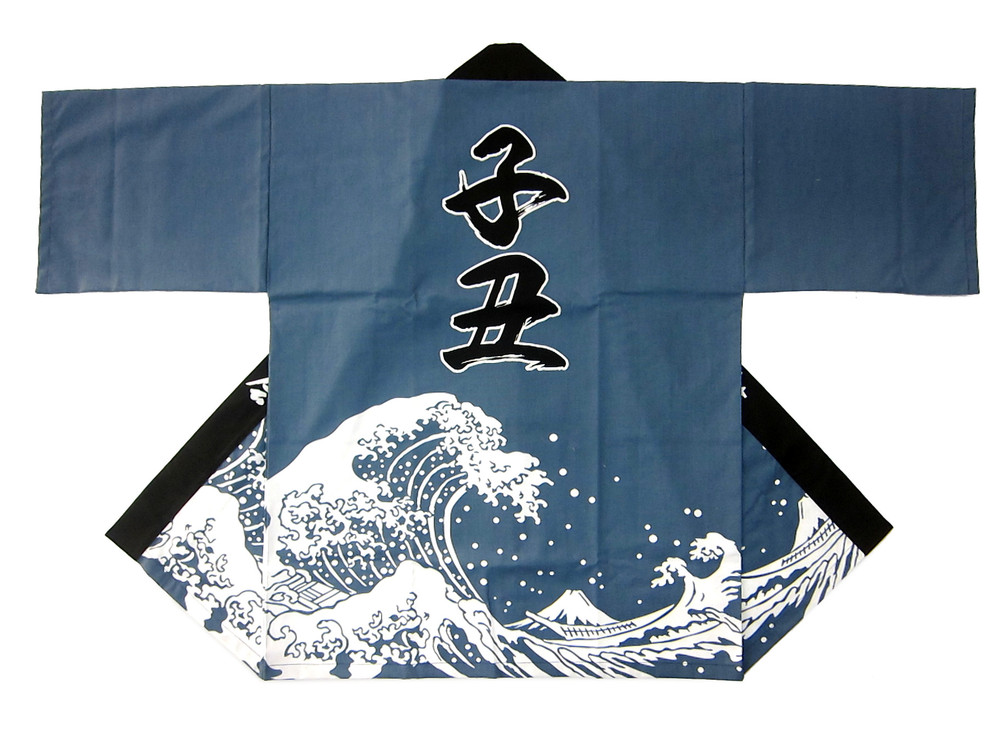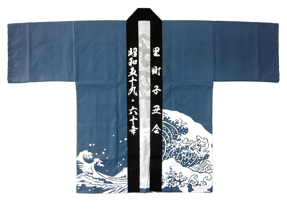 神社仏閣・厄年会様 里町子丑会様 愛知県安城市の厄年様です。 ややくすんだグレー地に黒文字と裾柄を白抜きで、全体的に落ち着いた色合いで仕上げました。 北斎の波柄も定番的ですがやはり素敵ですね。作成方法は本染め顔料染め、生地はシャークスキンで鮮やかに染め上がりました。