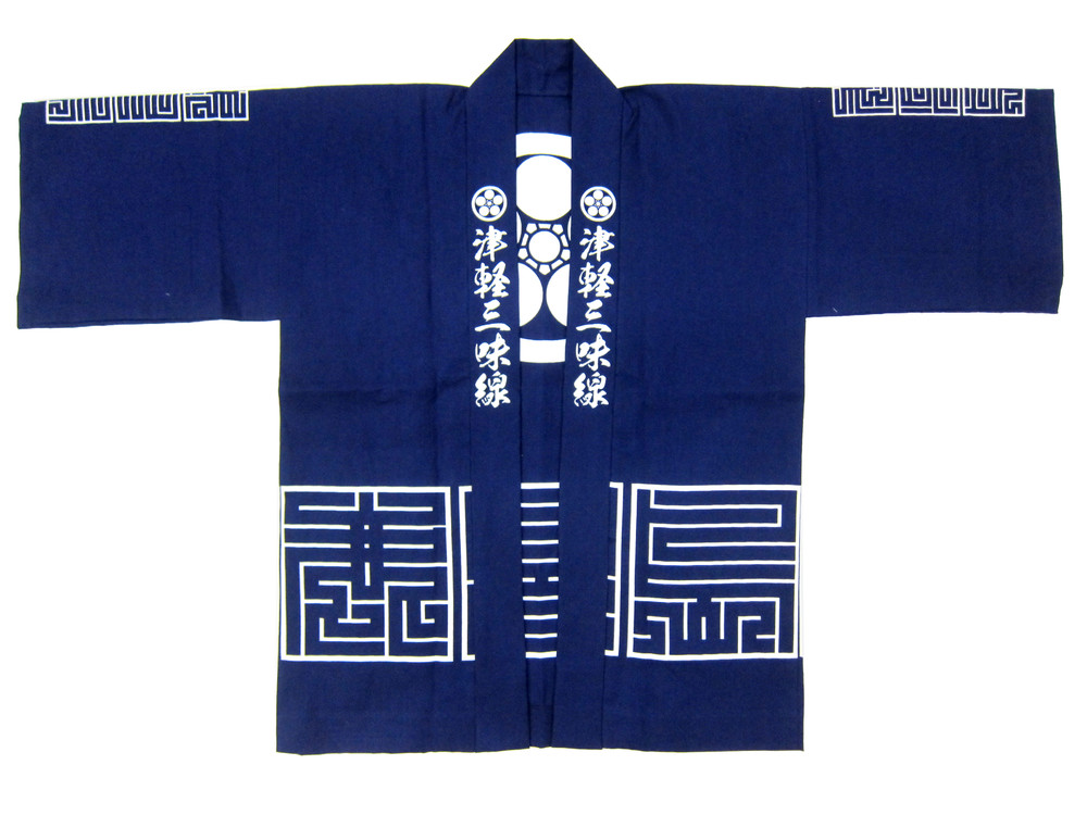 同好会・保存会様 津軽三味線様 鹿児島で津軽三味線の演奏活動をされている皆様よりご依頼いただきました。 生地はシャークスキン、反応染めで定番の紺色が鮮やかです。 肩から袖口にかけての角文字(鹿児島)がこだわりデザインですね。