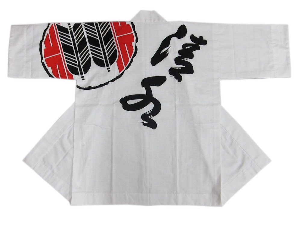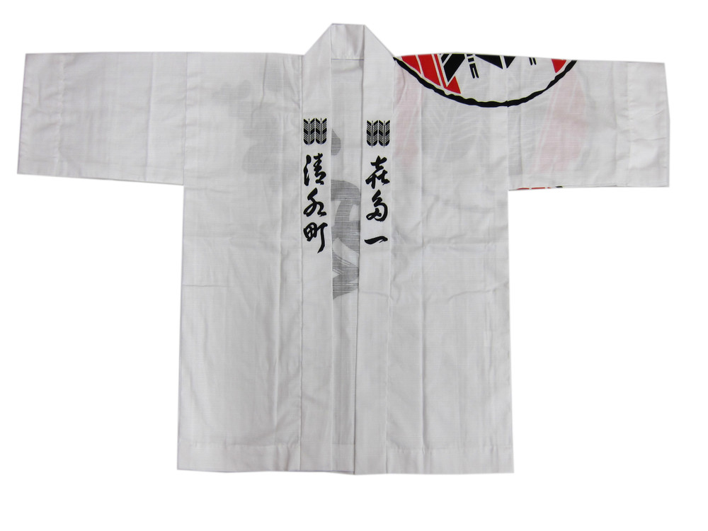 地域団体・業界団体様 清水町様 白地に紋を大胆に配置した素敵なデザインです。 素材は夏場に軽くて涼し気なシャンタン、作成方法は反応捺染ですので汚れて洗濯しても色落ちの少ない永く使用の可能な完全オーダー法被なのです。