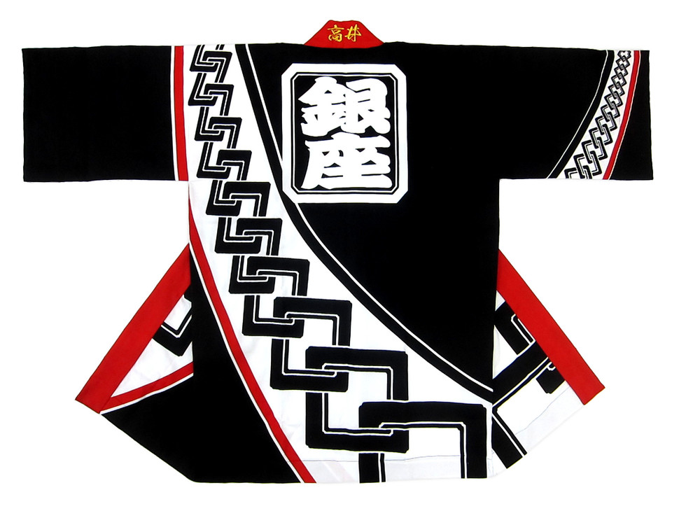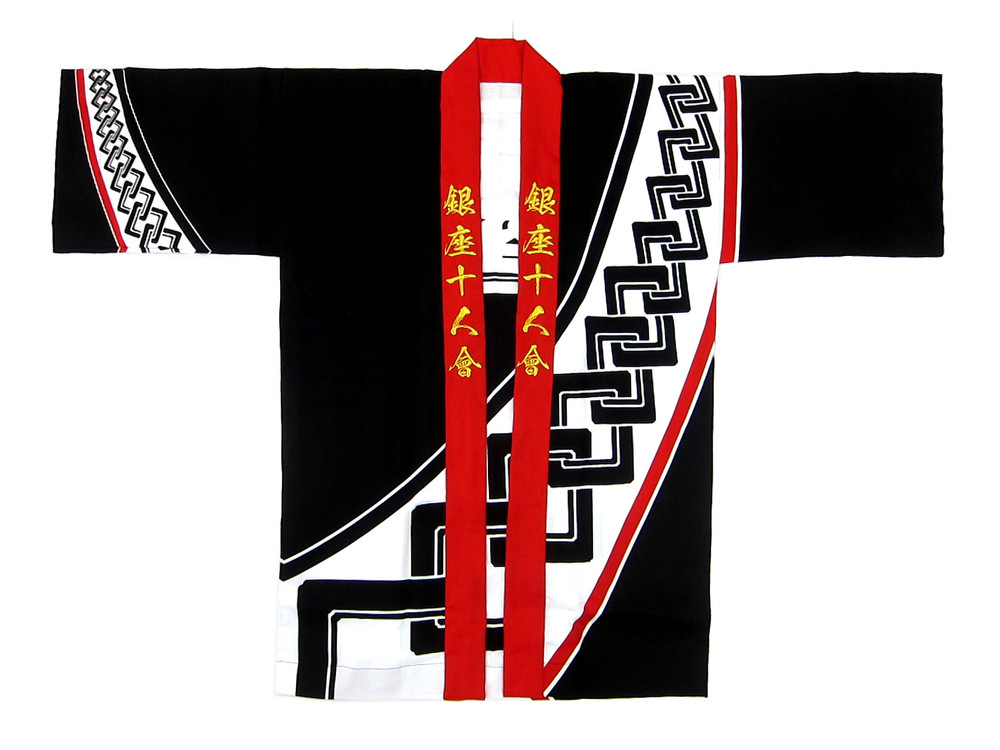 同好会・保存会様 銀座十人會様 前衿と衿首の部分の文字は金糸で刺繍を施してあります。 生地は発色性に富んだシャークスキン、染めは反応染料にての手染め本染めになります。 ダイナミックなデザインは今回の長法被(95cm)に良く映えて素敵です。