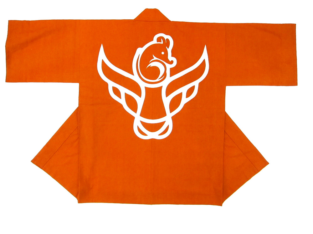 神社仏閣・厄年会様 上重原子丑会様 昨年度に続き本年度も新たな上重原厄年会の皆様、ご注文ありがとうございました!! 今年の法被デザインは背中に「子」「丑」を上手くイラスト化していただきました。本染め一色で染め上げたからし色っぽいオレンジがなんとも言えずにいい雰囲気ですね! 生地は木綿の定番天竺を使用、着心地も最高、来年の皆様の厄払いはこの法被で間違いないのです。