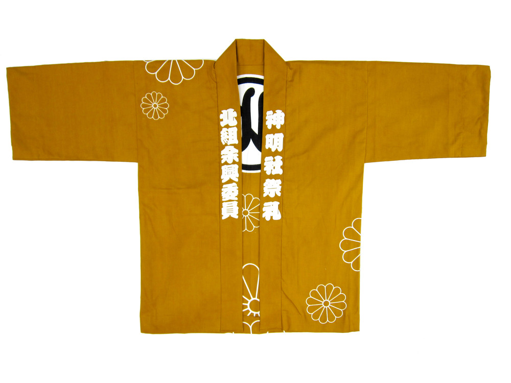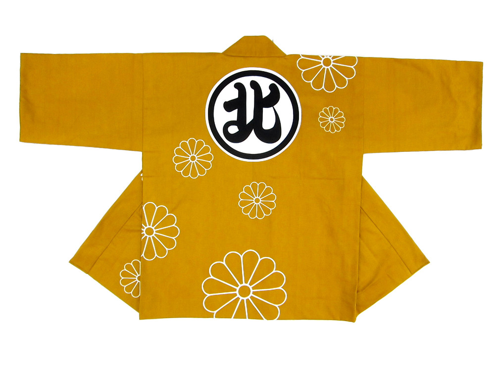 神社仏閣・厄年会様 神明社北組様 反応捺染(本染め)、からし色に黒で大紋を染めたシンプルなデザインです。 代々着用されてきた法被を今回追加で作成させていただきました。生地はシャークスキンと今回は丈夫な生地を選ばれました。 全体に配置された白抜きの十二葉菊が目立たず、でも存在感持ってバランスされていますね。