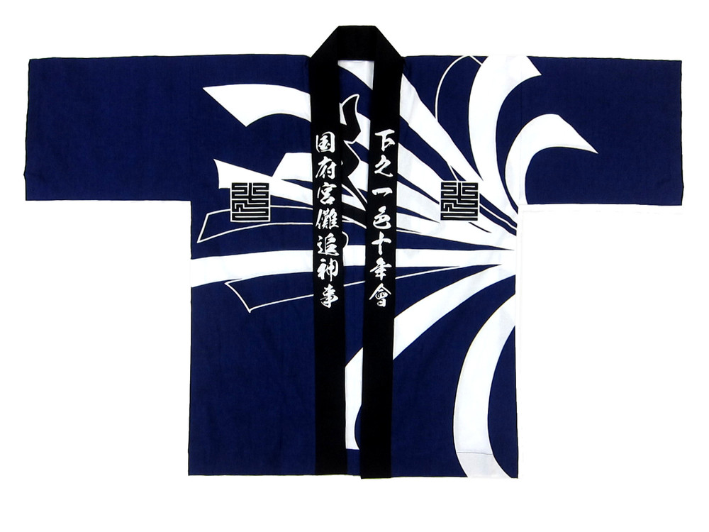 地域団体・業界団体様 下之一色十年會様 身頃に大胆にデザインされた熨斗の柄がグッドです! 生地は綿の定番素材天竺を使用した本染め(反応染め)仕様の軽くて丈夫なフルオーダー法被でございます。背中の一文字は「捁」でしょうか。環境依存文字と出て参りました・・・