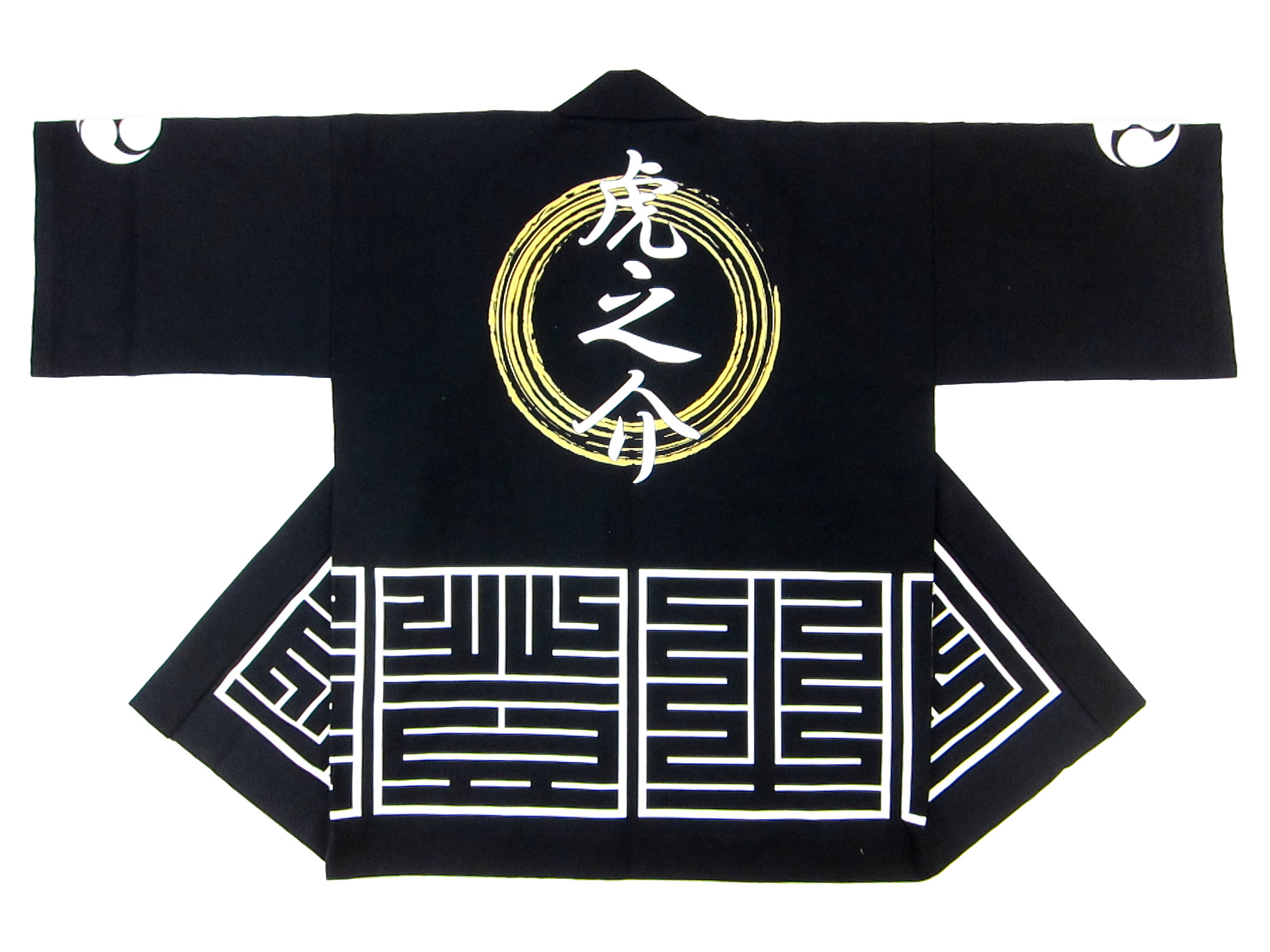 背紋の手書きイメージの丸は金のプリントです!シンプルな紺地に白抜きの本染めにひときわ目立つ素敵なデザインですね。素材は「11号帆布」というかなり厚地で重量感のある生地を使用していますが、羽織った時に肩でその重さを受け止め、意外とカラダにしっかりと馴染んで逆に力強さを感じられることでしょう。