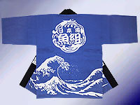 鮮やかな海のブルーに、背中のマークが引き立ちます。背紋の頂点に「カヤック」に乗った人・・・わかりますか。
