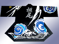 厄年会の皆様の法被です。個性的で大胆素敵なデザイン !贅沢に刺繍もふんだんに使っています。厄払いどころか元気の集まる法被ですよね !