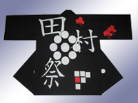 地域団体・業界団体様 田村祭様 アートですね!皆様のいただく中心の紋が「九曜紋」というのも、 この斬新なデザインにはぴったり合っています。お客様による自由な構図が時としてこんなポップアート法被を生み出すのです。脱帽!