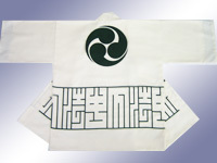 三つ巴の紋に裾の周り柄は「下法中」という文字の角文字です。現在は法被の世界くらいでしかお目にかかる事も少なくなりましたね。日本人の考え出した文字様式ってなかなか奥深いと思いませんか?素材も晒し加工前の「生成り」地をあえて使用して法被の原点を再現してみました!粋!