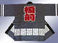 ベースは濃紺とグレーの配色の総柄に背紋を渋めの赤色で、そして裾に白抜き角文字を配し袖口にもワンポイントでラインをお入れしました。襟の裏には名前を刺繍で入れ、ポケットも両サイドに附属しており、まさにフルスペックな法被の出来上がりです。法被をお渡しした時の皆さんの満足顔に元気をいただきました~!