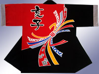 鮮やかな配色の切り替えと中央の熨斗柄が「粋」な仕上がりとなりました。最近の厄除け行事に着用する法被は、皆さん個性と派手さがお好みのようで・・・良いですね!