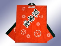太鼓の衣装としての法被の多くは袖なしが多いですね。バチを持つ手を華麗に動かすのには袖は少々お邪魔なようで・・・でも、以外に袖なしの法被はコーディネートしだいではお洒落なアイテムなのです。下に着用されるシャツとかパンツや帯など、今回のように鮮やかなオレンジ色に映える配色ってどんなイメージなのでしょうか。