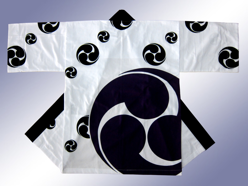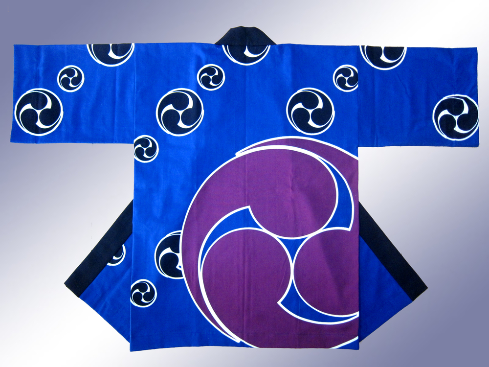 大小取り混ぜた「三つ巴」の紋を規則的に配列した斬新デザインな法被です。