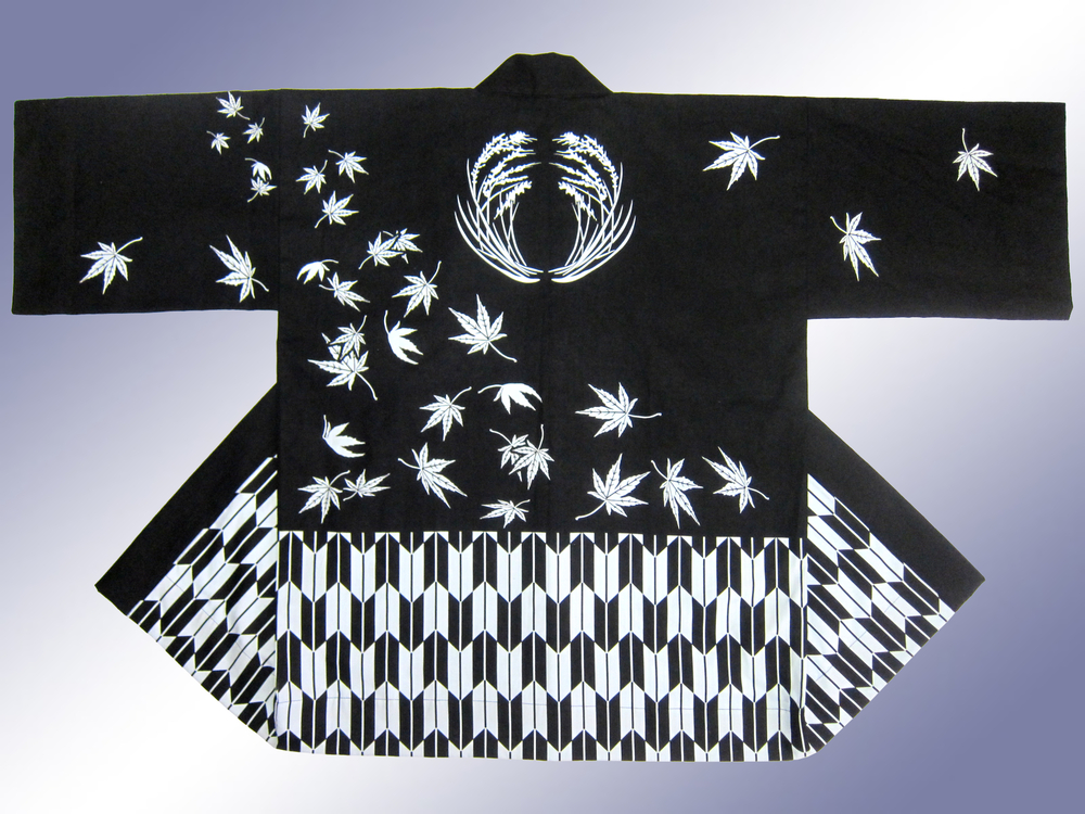 モノトーンベースに矢絣(やがすり)を腰柄に、肩口から裾に向かって舞い散る「もみじ」と大紋の「稲穂」が日本の四季と収穫を祝う思いが込められています。